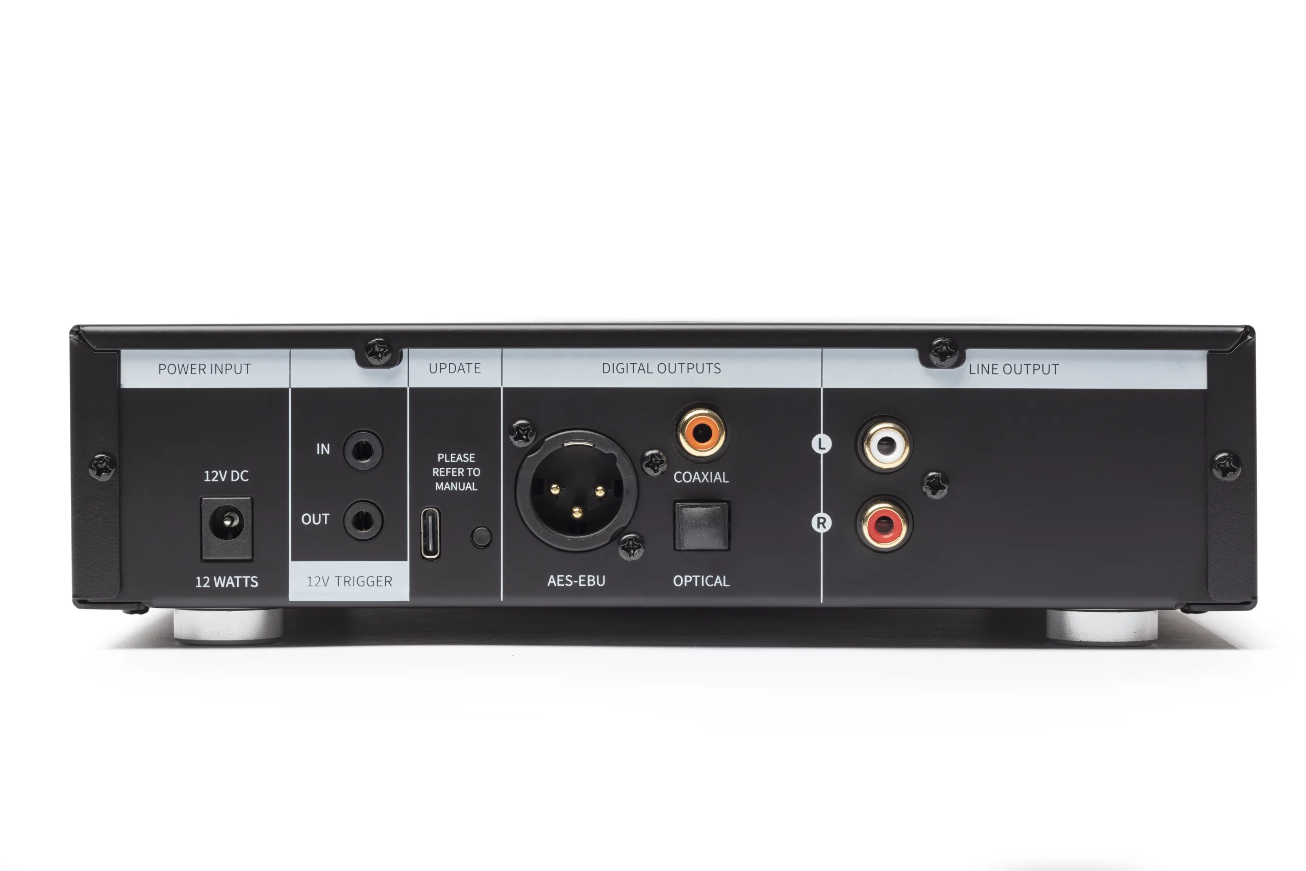 Digitale uitgangen: 1x coaxiale RCA, 1x optische TOSLINK, 1x AES-EBU gebalanceerde digitale XLR