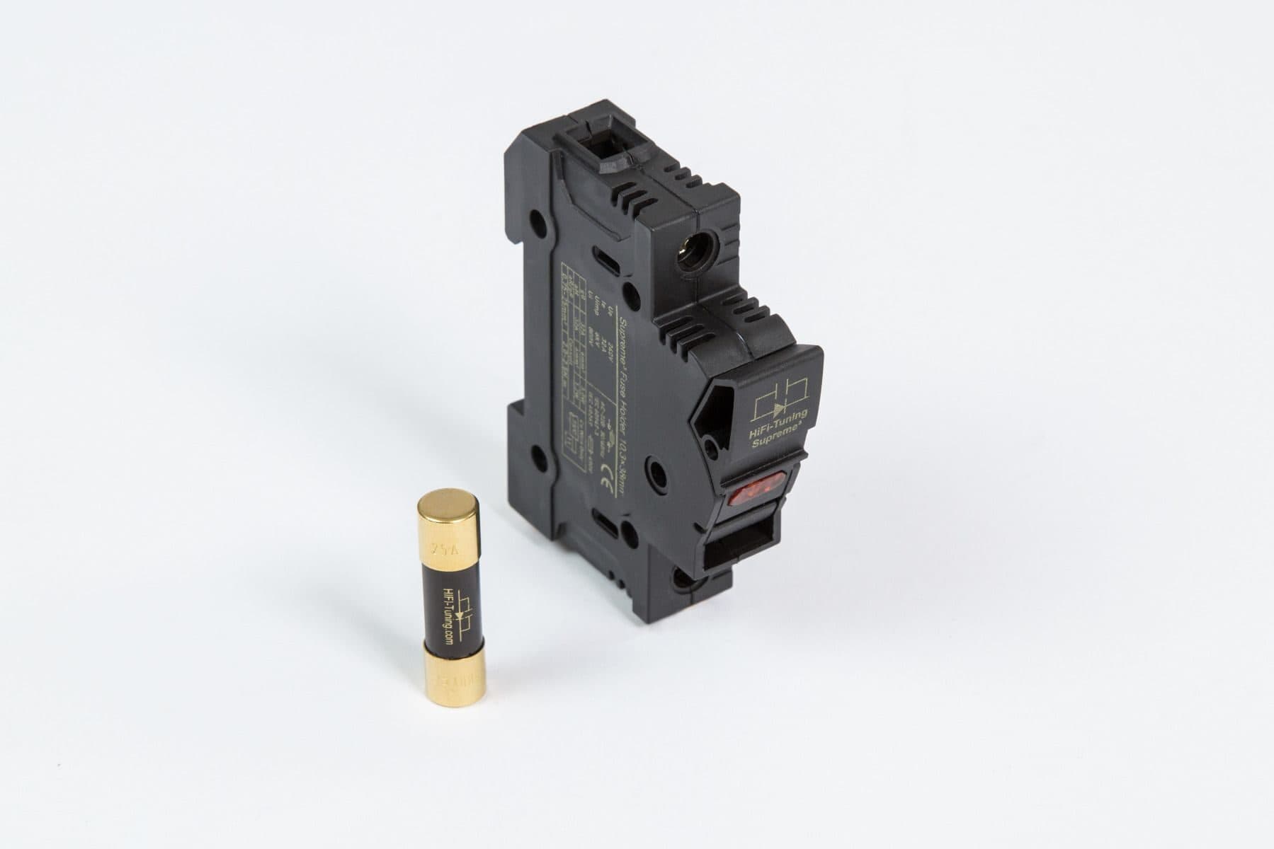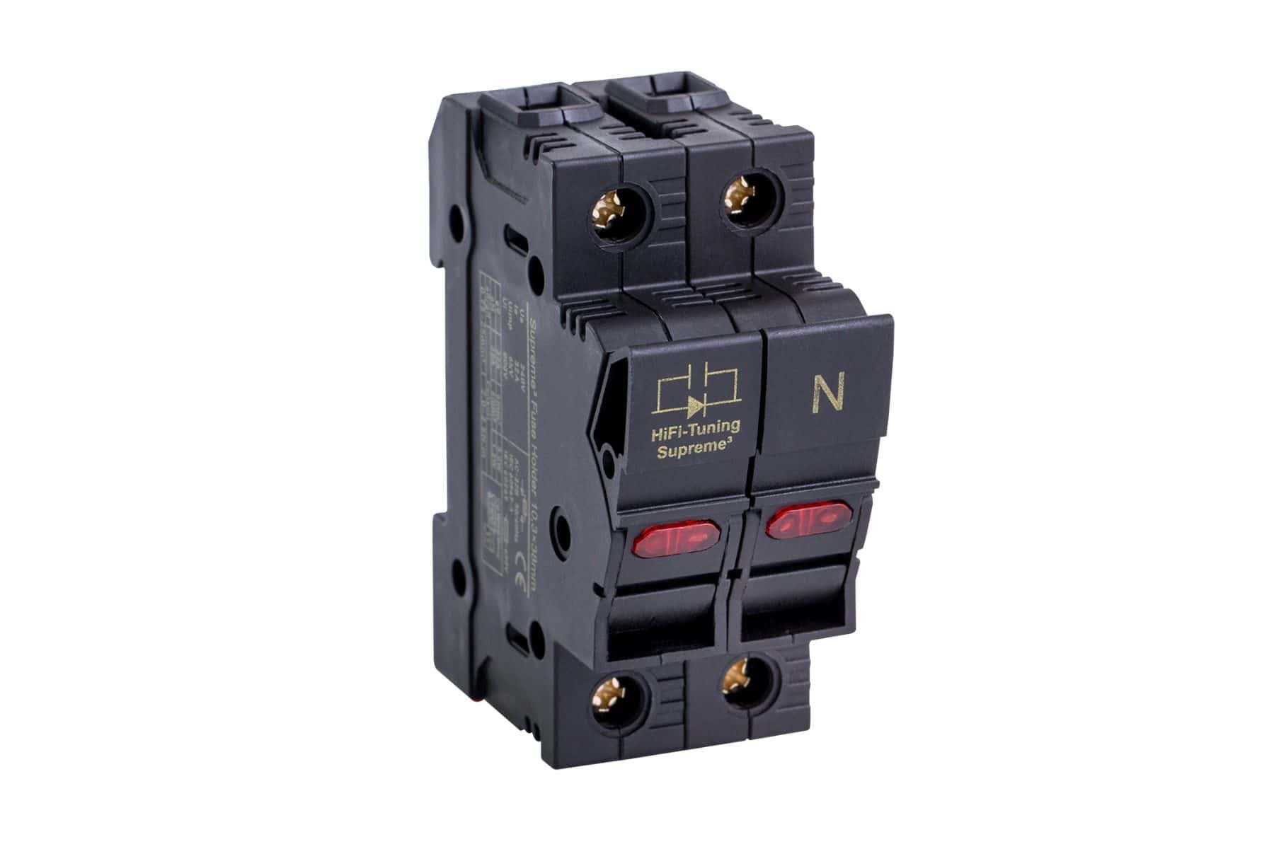 Bernd Ahne van HiFi-Tuning heeft veel nagedacht over de invloed van zekeringhouders in de zekeringkast om tot een optimale geluidsweergave te komen. Per slot van rekening moet de hele stroomvoorziening van het hifi-systeem door dit knelpunt. Er is bijna geen andere plaats waar het geluid van het systeem zo gemakkelijk kan worden verbeterd. De productie van een volledig unieke zekeringhouder met al zijn certificeringen is een illusie voor een klein bedrijf. Dus zocht Ahne een grote Aziatische leverancier die bereid was om aan de buitengewone eisen van hifi-tuning te voldoen, zolang hij maar vooruit betaalde. Het resultaat van deze samenwerking is een zwarte zekeringhouder met een ongewoon interieur. Het begint met de interne schroeven, die zijn gemaakt van niet-magnetisch roestvrij staal, en gaat verder met de geleiders van zuiver koper, die zijn verzilverd, verkoperd en verguld. Deze schijnbaar absurde inspanning wordt geleverd om een permanent stabiel geleidingsvermogen te bereiken dat veel hoger is dan dat van messing. In Berlijn wordt de zekeringhouder gecryogeniseerd in een stikstofbad. Strikt genomen zijn er nog een paar stappen bij betrokken, maar die blijven Bernd Ahne’s bedrijfsgeheimen om imitatie te voorkomen. De zekeringhouder is geschikt voor Supreme³ zekeringen in 10,3 x 38 mm formaat tot 32 A. Het is aan te bevelen om voor het plaatsen met een droge doek vet van de zekeringdoppen te verwijderen. In huishoudens worden meestal 16A zekeringen gebruikt. – Let op: Het installeren van de zekeringhouder is een klus voor een elektricien! Speel niet met de zekeringkast, maar speel muziek.