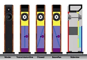 Door een andere opvallende constructie is de behuizing te verstellen in zowel een gesloten kast, een bassreflex of een transmissielijn principe. Dat gebeurd met een kantelbaar schot dat via de achterkant bereikbaar is. Het grote voordeel is dat de bass response naar wens van de luisteraar instelbaar is.